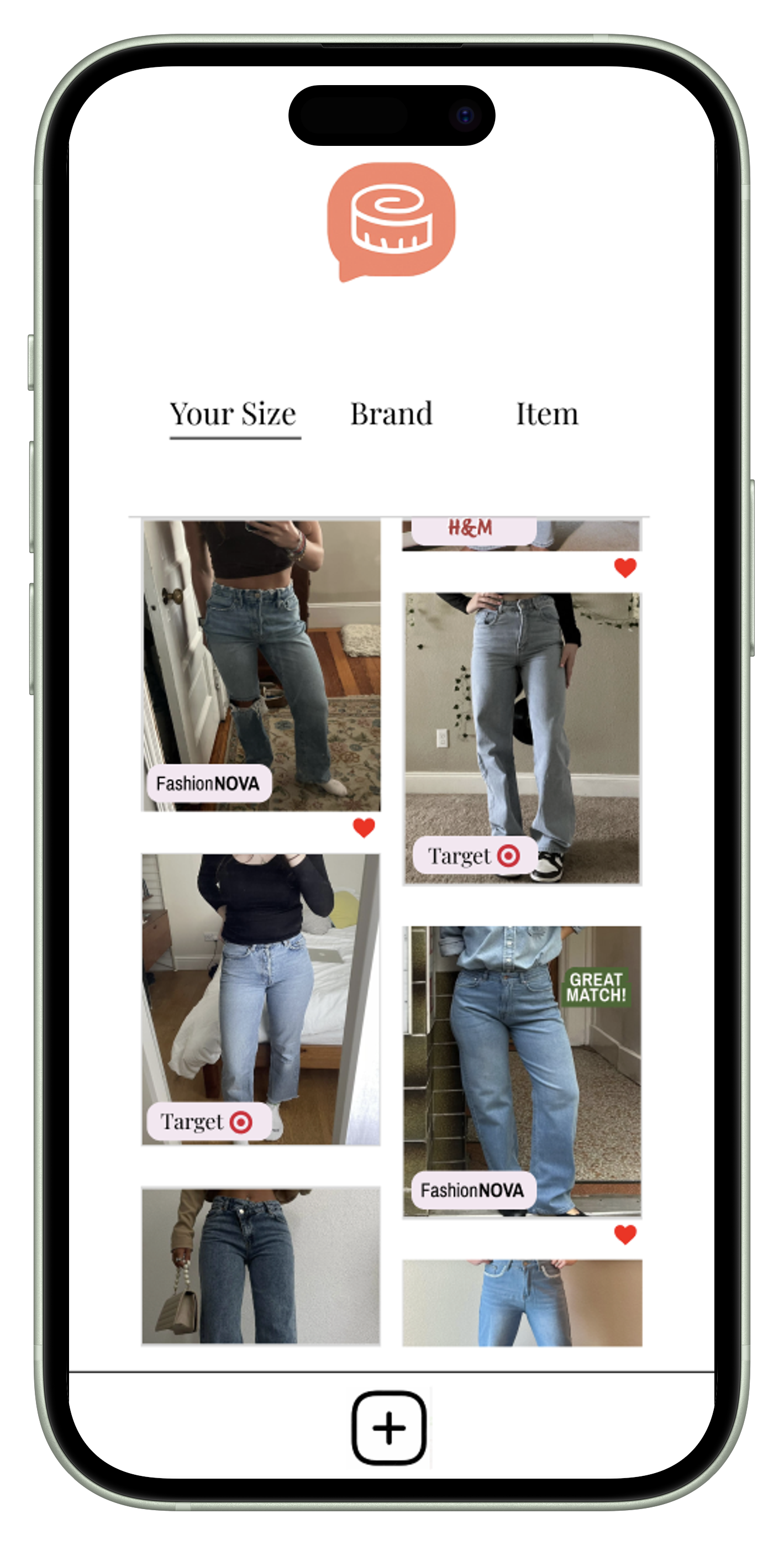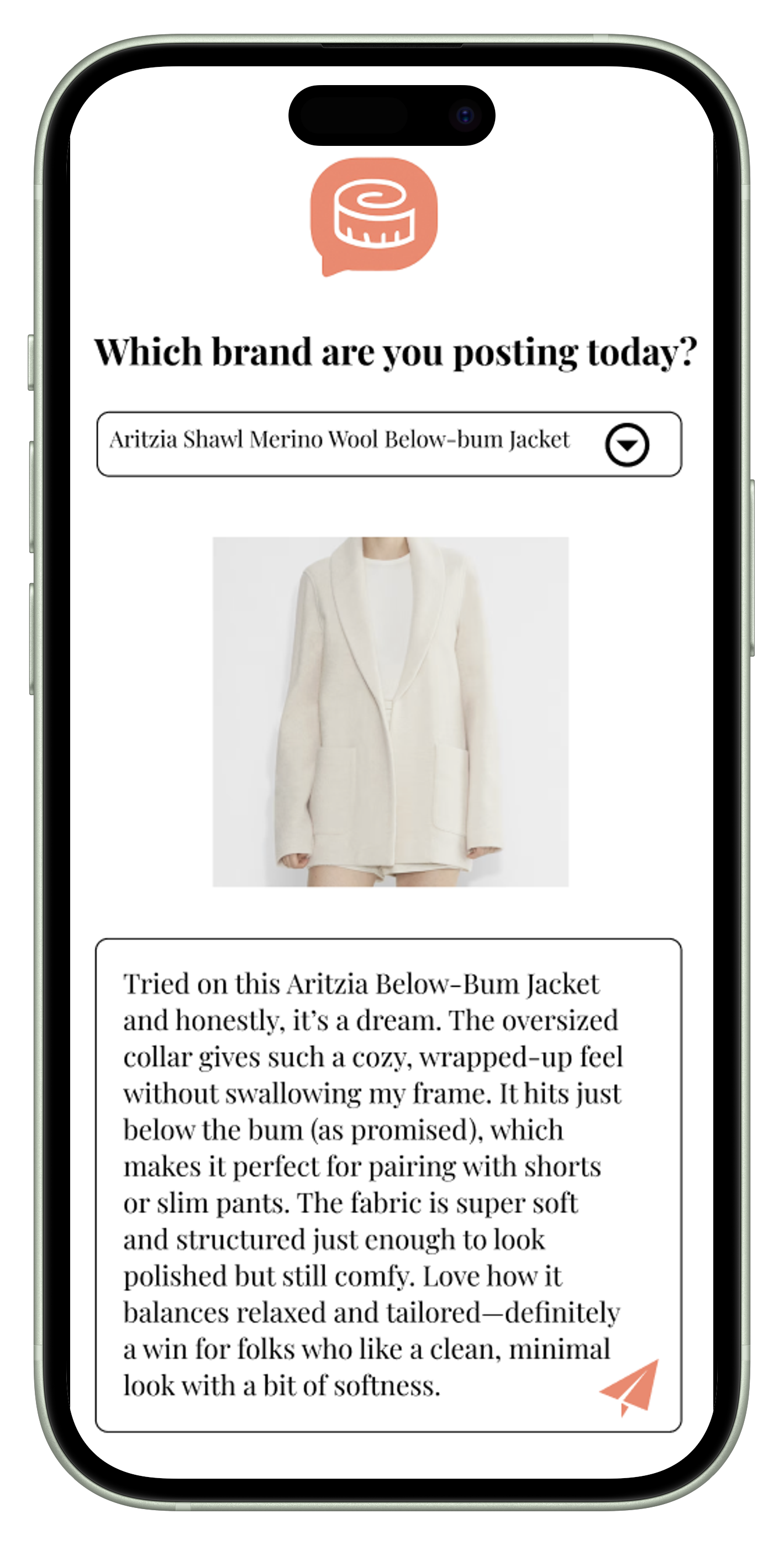 The “Fit for You” feed curates posts from users with similar body types, sizes, and preferences. Filters (by size, brand, and item) make it easier to navigate and discover relevant posts. This directly addresses the issue of information overload and gives users confidence in how an item might fit them